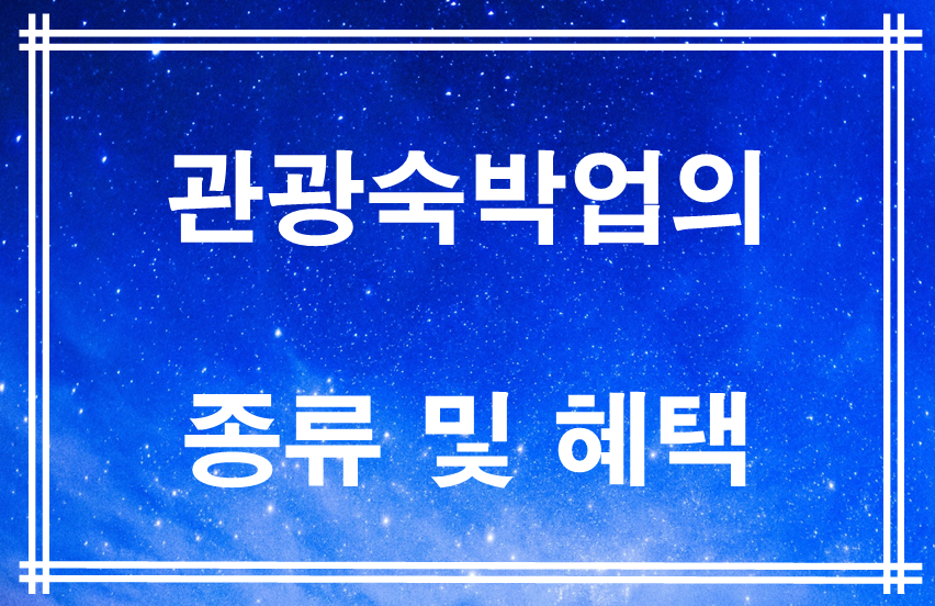 관광숙박업은 "관광진흥법"상 숙박업으로 정부 정책자금인 관광진흥개발기금을 사용할 수 있는 숙박업으로 조건과 절차는 엄격하지만 많은 혜택이 있습니다. 특히 일반 숙박업과 차이가 있는 것은 일반적인 여관이나 모텔 또는 관광숙박업이 아닌 호텔의 경우에는 "공중위생관리법"에 따라 일정 조건만 맞으면 개업이 가능하지만 혜택이 없습니다.