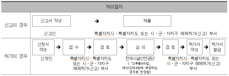 「건축물관리법」 관리자가 건축물을 해체하려는 경우에는 특별자치시장ㆍ특별자치도지사 또는 시장ㆍ군수ㆍ자치구 구청장에게 허가를 받아야 합니다. 다만, 「건축물관리법」 제30조제1항 각 호의 어느 하나에 해당하는 경우에는 신고를 하면 허가를 받은 것으로 봅니다.
