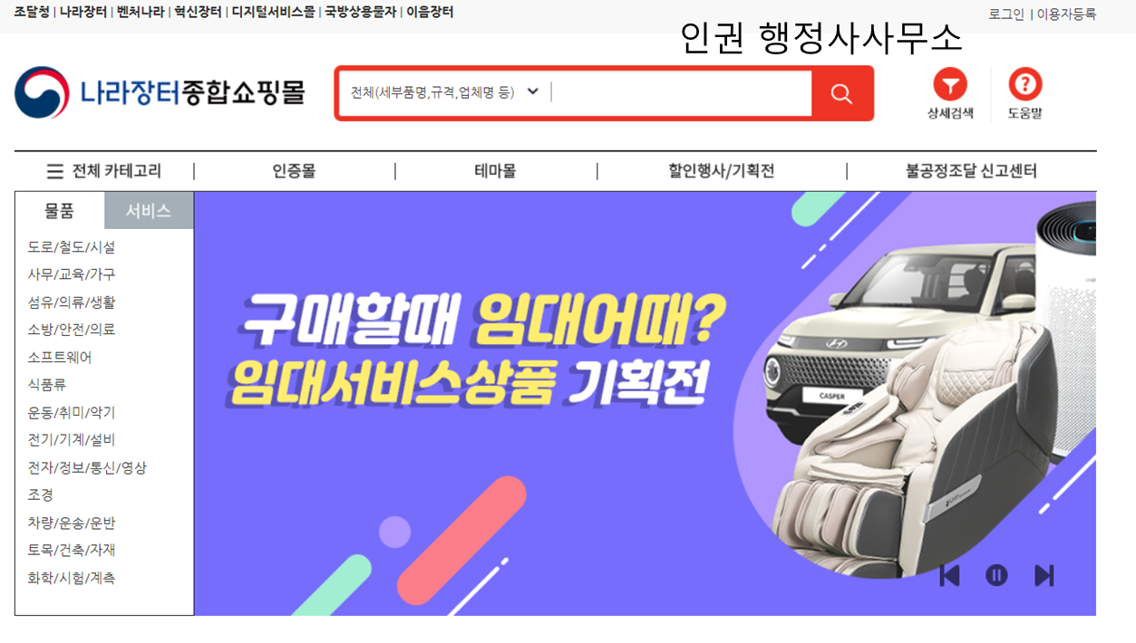 나라장터 종합쇼핑몰 사업을 하기 위해서는 많은 지식이 있어야 하며、 인터넷에 컨설팅 업체부터 행정사 광고가 많이 있습니다。 우선 조달청 사업은 “조달사업법”과 “전자조달법”이라는 행정법으로 구성이 되어 있기 때문에 변호사 또는 행정사가 아닌자가 조달사업에 관한 법률상담을 하는 것은 불법으로 이를 이유로 비용을 지불한다면 불법계약으로 문제가 발생할 수 있으며、 조달청 관련 업무를 수임하는 것은 불법입니다。 행정사사무소에서 하는 것은 합법이지만 조달업체에서 근무경력이 없는 젊은 행정사나 조달청 출신 행정사님들은 조달업체에 마케팅이나 경쟁업체 분석에 대해서 경험이 부족하기 때문에 매우 위험합니다。 인권 행정사사무소 대표 이효종은 조달업체서 15년간 근무 경험으로 단순한 수의계약부터 우수조달까지 다양한 경험과 마케팅 경험이 있습니다。