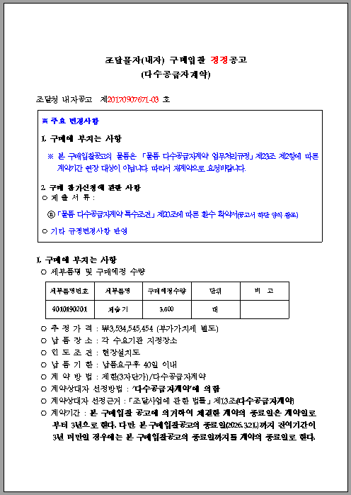 - 공공조달 최소녹색기준의 적용을 받는 제품(규격)은 효율관리기자재 운용규정의 개정에 따라 최저소비효율기준 1.0, 소비효율등급부여기준 2.50 ≤ R, 대기전력 ≤ 0.5W인 제품만을 협상대상으로 인정합니다.