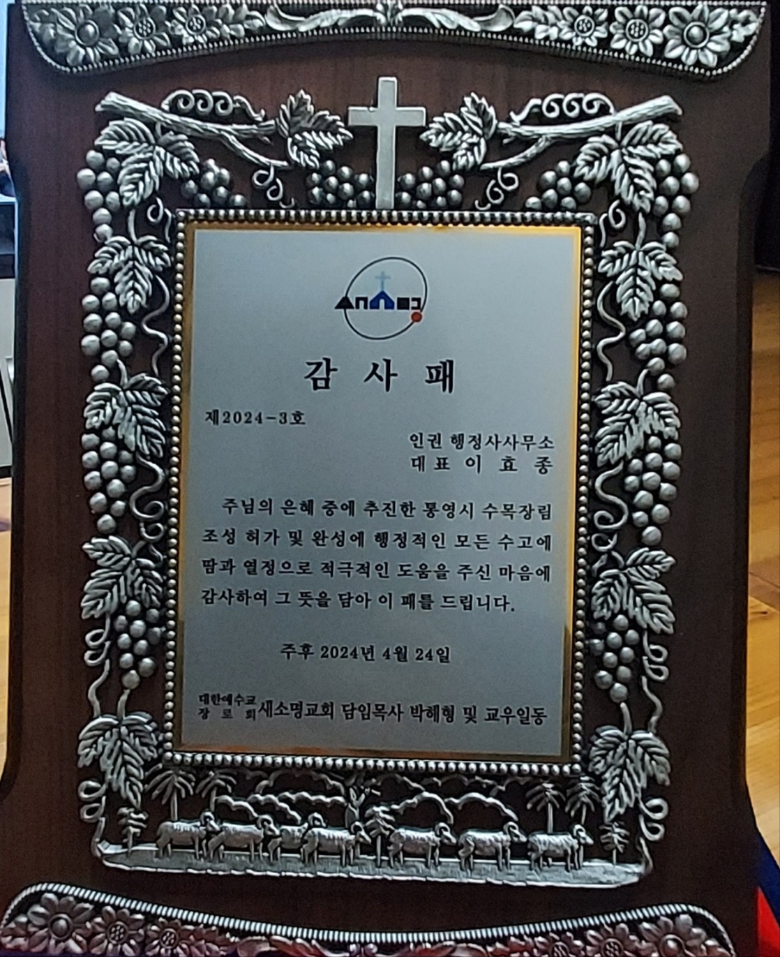 장소는 통영시에 있으며 조성허가 후 조성이 끝나고 새소명교회에서 감사패를 수여받았습니다.