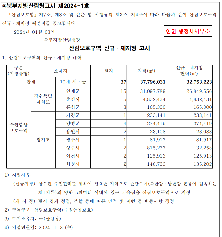 2) 지정해제 예정 산림보호구역의 소재와 면적