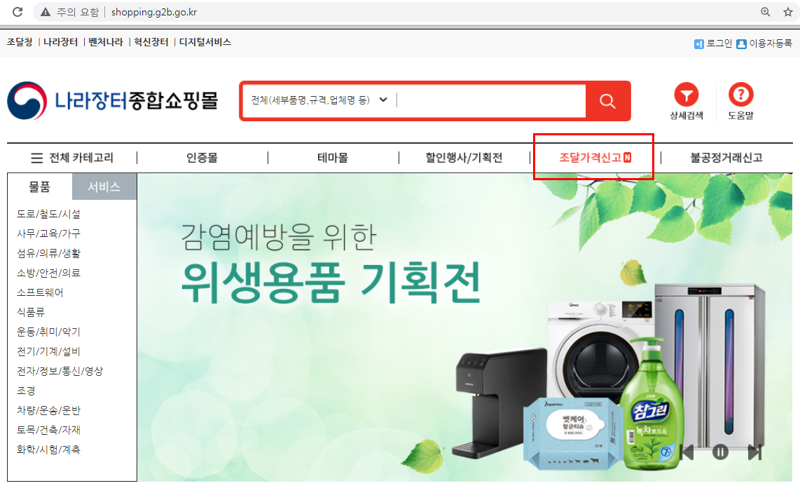 위에 화면은 나라장터 종합핑몰에 조달가격신고에 주목해야 합니다.