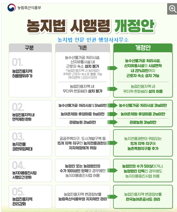 농업진흥구역의 개발은 건축사사무소나 토목측량업체에서는 잘 모르는 경우가 대부분이고, 농업진흥구역 전문 행정사만 할 수 있는 영역이만 대한민국 최고의 1인자는 환일행정사 사무소 이태용 대표님과 인권 행정사사무소 이효종 대표이며, 행정사의 역할은 당연히 해당 업무에 인허가 업무는 총괄합니다. 특히 문제는 담당 공무원이 전문 지식 없이 무책임하게 불가하다고 하는 경우가 대부분으로 민원인은 법령에서 정한 권리를 침해당하는 경우가 많습니다. 농업진흥구역 전문 인권 행정사사무소 이효종 대표는 무책임한 공무원에게 법령에서 정한 권리를 침해 당하는 경우는 국민으로서 담당 공무원을 문책하고 심하게는 형법상 직권남용죄로 문제를 제기하며 적극적으로 문제를 해결하고 있습니다. 농업진행구역 개발이 원하시는 국민께서는 도움을 받으시고 국민으로서 권리를 지키시길 바랍니다.