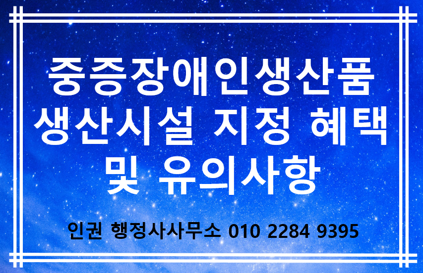 중증장애인생산품 생산시설 지정시 관련 생산품은 위에 규정에 따라 다양한 혜택이 있습니다. 정부에서 법령을 제정하여 혜택을 주는 중요한 이유를 알아야 본질을 접근할 수 있습니다. 첫 번째 중증장애인은 통상적인 근로를 제공하기 어려운 분으로 생산품 및 노동의 질이 매우 낮아 경쟁력이 없다는 것입니다. 두 번째는 사업주는 중증장애인의 업무로 인하여 문제가 없도록 다양하게 보살펴드리여야 합니다. 이러한 문제로 생산에 어려움이 있어서 정부에서 혜택을 주는 것입니다. 그러나 사업주에게는 생산에 어려움이 있지만 판촉에도 도움이 되어 권장하는 사업입니다. 중증장애인생산품은 인권 행정사사무소가 유명한 이유는 이러한 것을 복합적으로 생각하고 사회적기업, 장애인표준사업장 등 각종 인증을 획등함으로써 사업에 도움이 될 수 있도록 도움을 드리고 있습니다. 장애인관련 사업을 운영하시는 분들과 함께 일을 하면서 각종 고충을 들으면서 많은 도움을 드리고 있습니다.